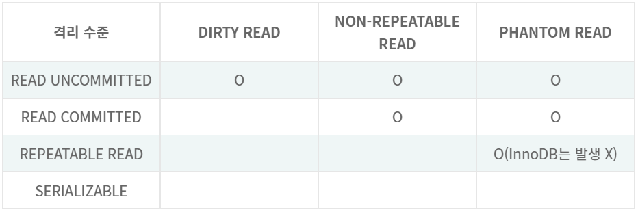 - 이러한 문제로 인해 ANSI 표준은 트랜잭션의 격리 수준을 4단계로 나누어 정의
